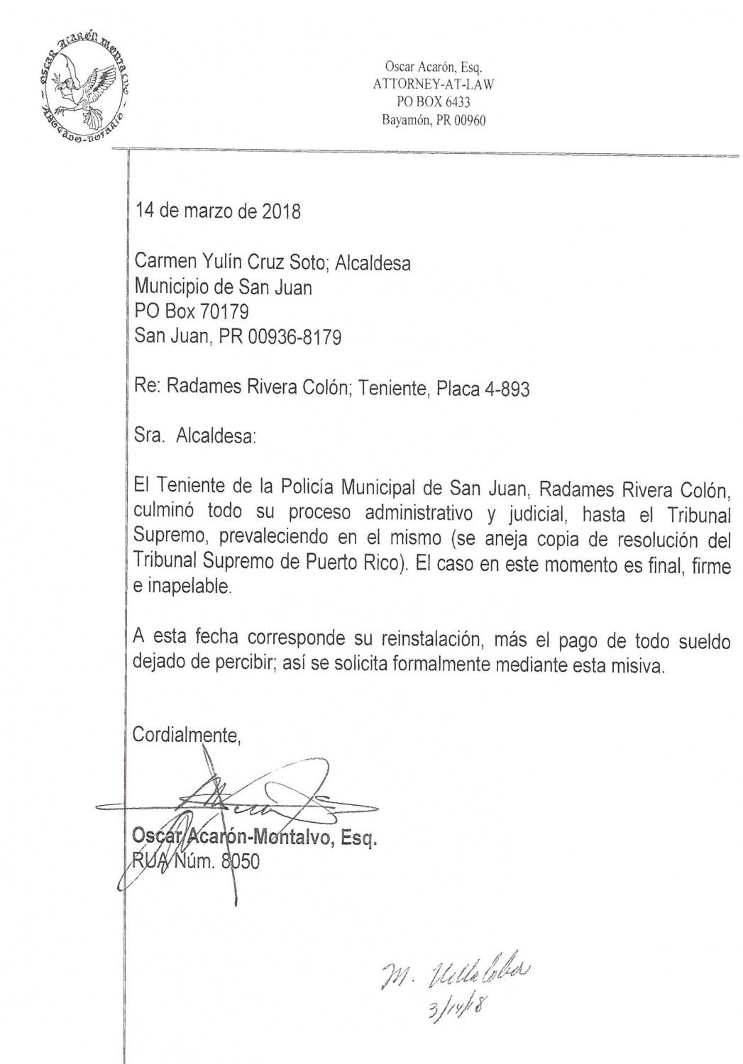 A meses de esta decisión, el municipio se negaba a la reinstalación del teniente por lo que este solicitó al tribunal de San Juan que ordenara al municipio seguir la orden del supremo.