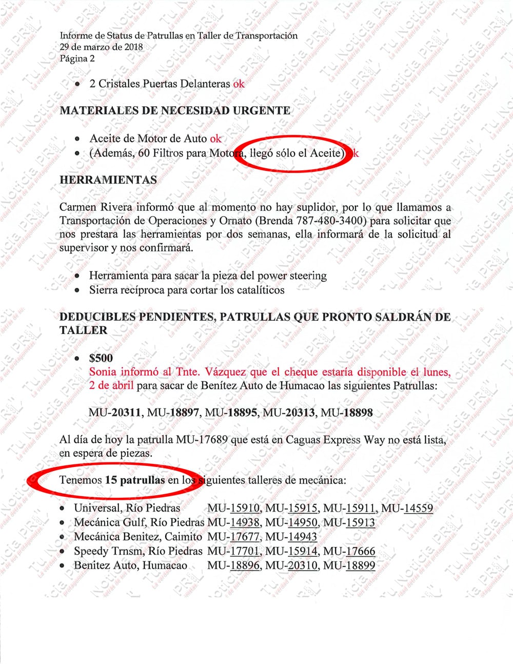 Así lo demuestra un documento oficial que obtuvo en exclusiva Tu Noticia PR, que detalla algunos de los vehículos de la policía detenidos, y las razones en su mayoría es por falta de aceite. Dicho documento será enviado mañana al comisionado Guillermo Calixto, quien solicitó el inventario de patrullas detenidas luego de la publicación por este medio.