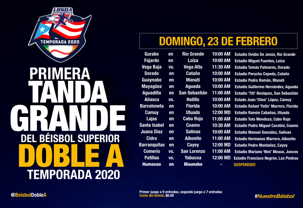 Además, Añasco vs. Hatillo (10:00 am) en el estadio de Camuy, Aguada en San Sebastián (11:00 am), Mayagüez en Aguada (10:00 am), Dorado en Cataño (10:00 am) y Vega Baja vs. Vega Alta (11:30 am) en el estadio de Dorado. INS