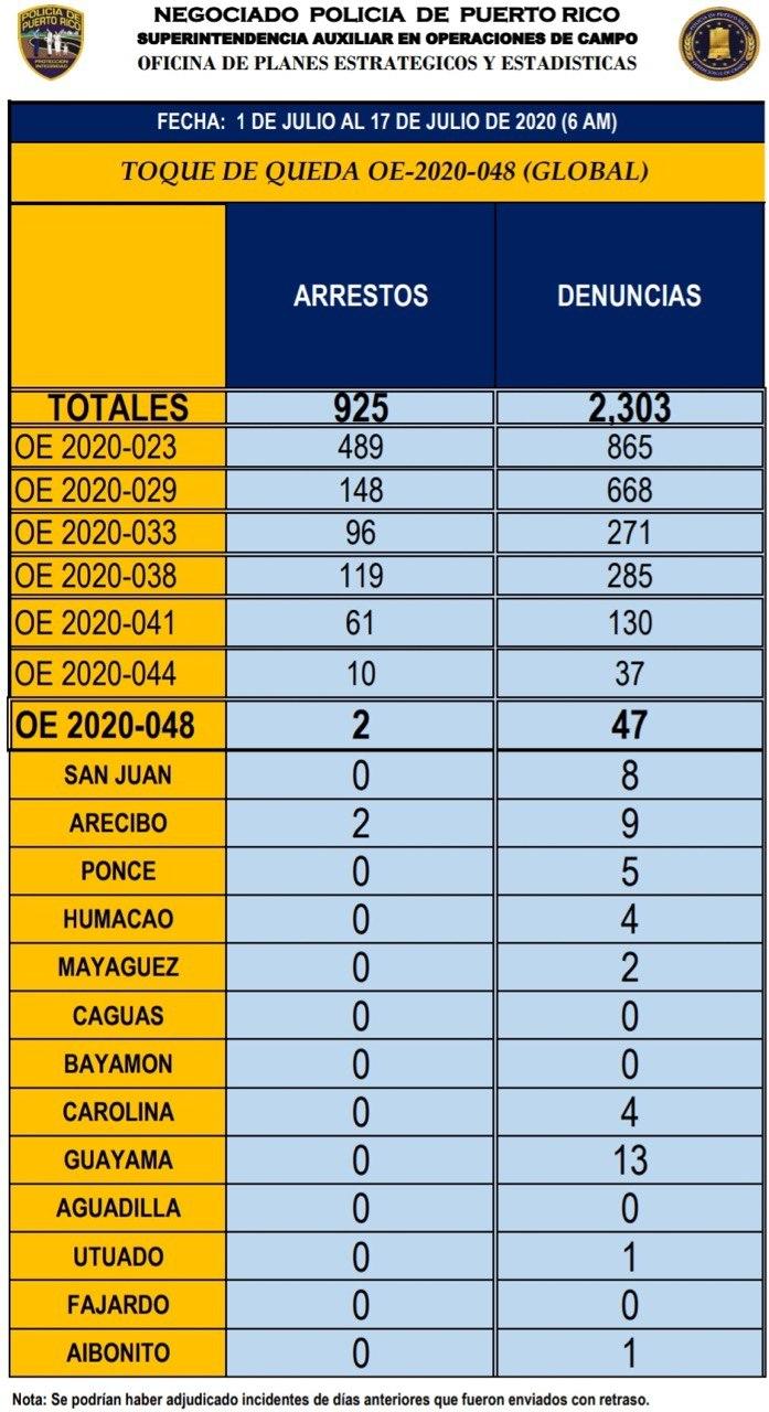 Según los datos provistos por la Superintendencia Auxiliar en Operaciones de Campo, del 1 de julio al 17 de julio, la Policía ha realizado 2 arrestos y 47 denuncias por distintas violaciones a la Orden Ejecutiva 2020-048 que venció el jueves.