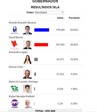 Tras contabilizarse 420,906 votos, Rosselló Nevares obtiene 179,490 (42.64%), mientras que Bernier logra 167,585(39.82%).