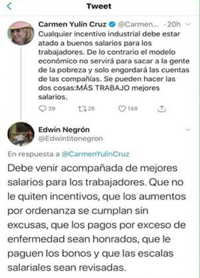 La alcaldesa de San Juan, Carmen Yulín Cruz, recurrió nuevamente a Twitter para exigirle a la gobernadora detalles que deben tener los incentivos industriales en beneficio a los trabajadores.