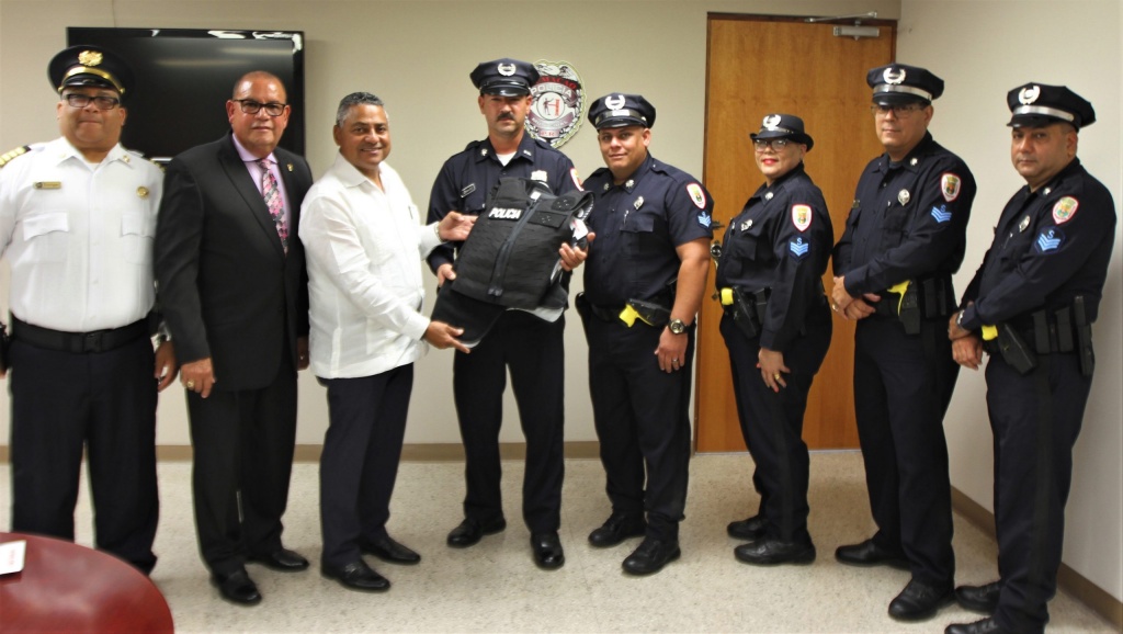 El alcalde de Humacao, Luis Raúl Sánchez Hernández, entregó nuevo equipo a los miembros de la Policía municipal junto al comisionado del cuerpo policíaco, coronel Orlando Meléndez Serrano.