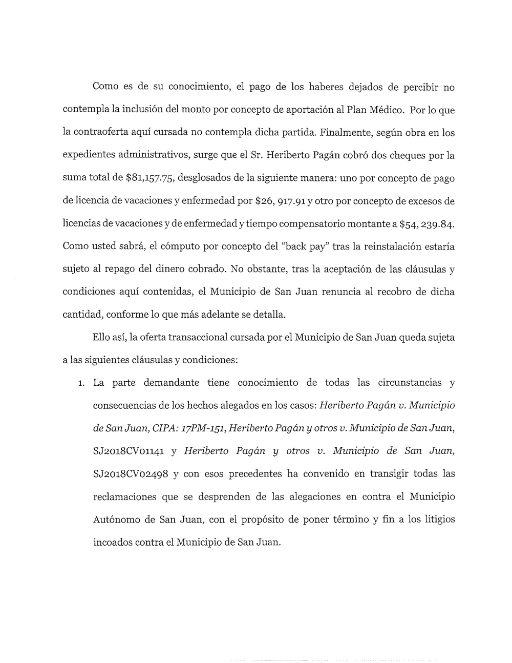 La alcaldesa, quien se ha negado a reinstalar al inspector con todos sus beneficios como indicó el tribunal, ofreció por medio de sus abogados, el licenciado Frank Torres Viada y la licenciada Alexandra Rivera Ríos, la reinstalación y el pago de más de 100 mil dólares en un solo cheque con la condición de que este retire la demanda en contra de la alcaldesa y el municipio por los daños que este sufrió.