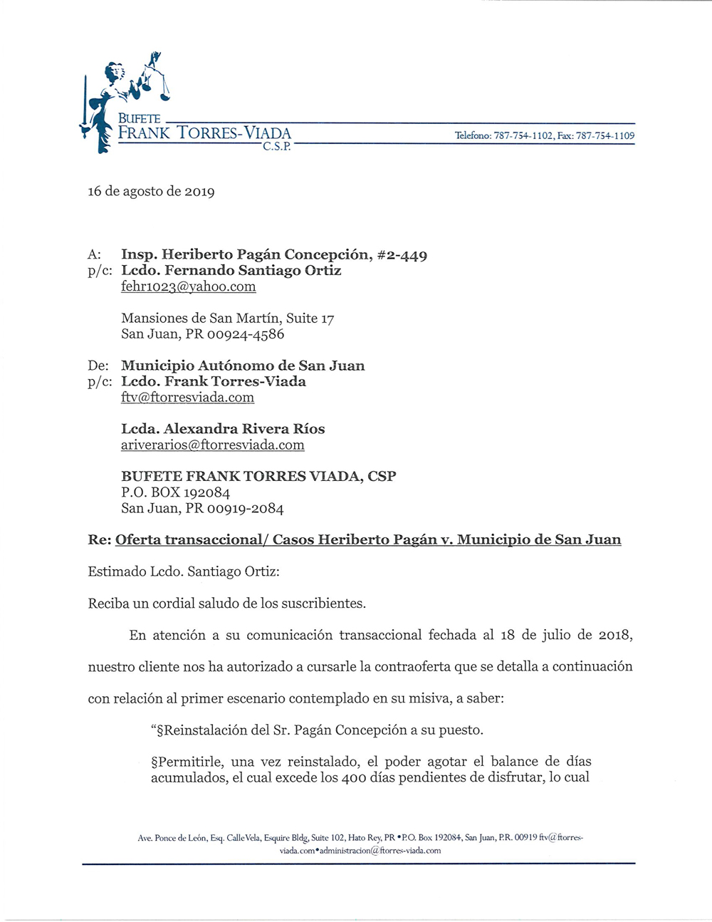 Tu Noticia PR tuvo acceso a la oferta de la alcaldesa Carmen Yulín al inspector para su reinstalación.