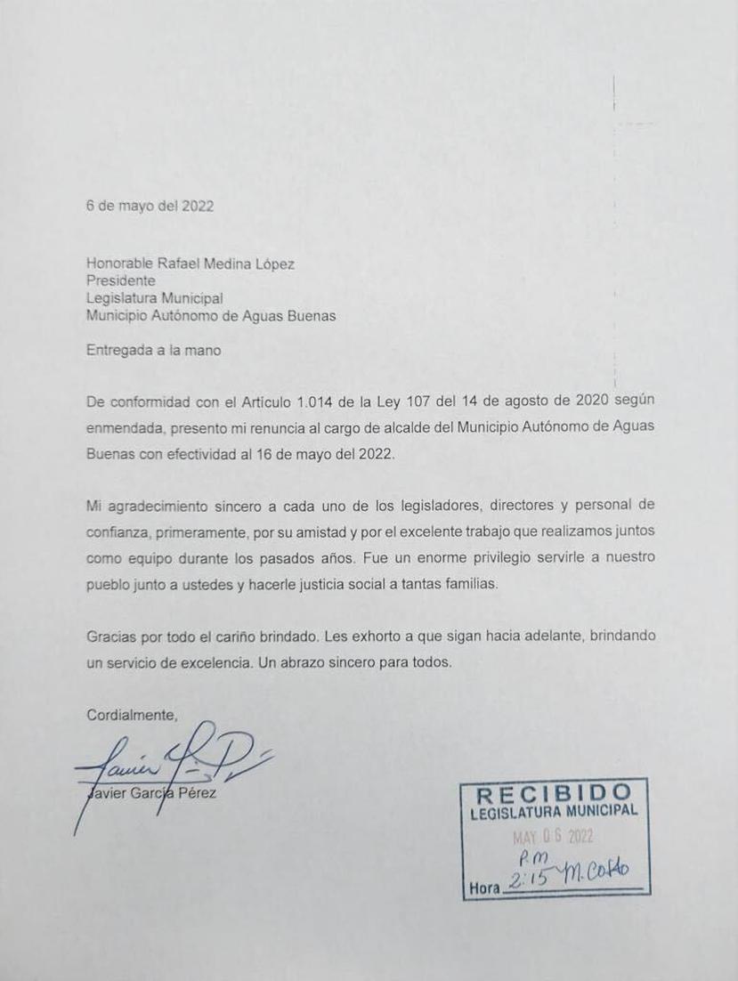 "De conformidad con el Artículo 1.014 de la Ley 107 del 14 de agosto de 2020 según enmendada, presento mi renuncia al cargo de alcalde del Municipio Autónomo de Aguas Buenas con efectividad al 16 de mayo de 2022”, reza la carta de dimisión.