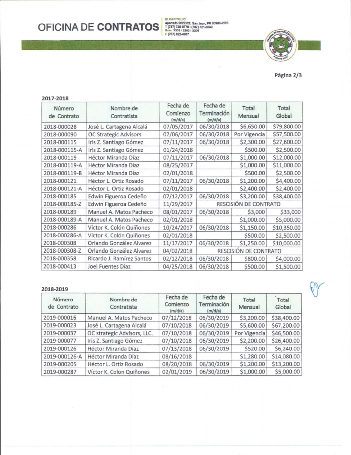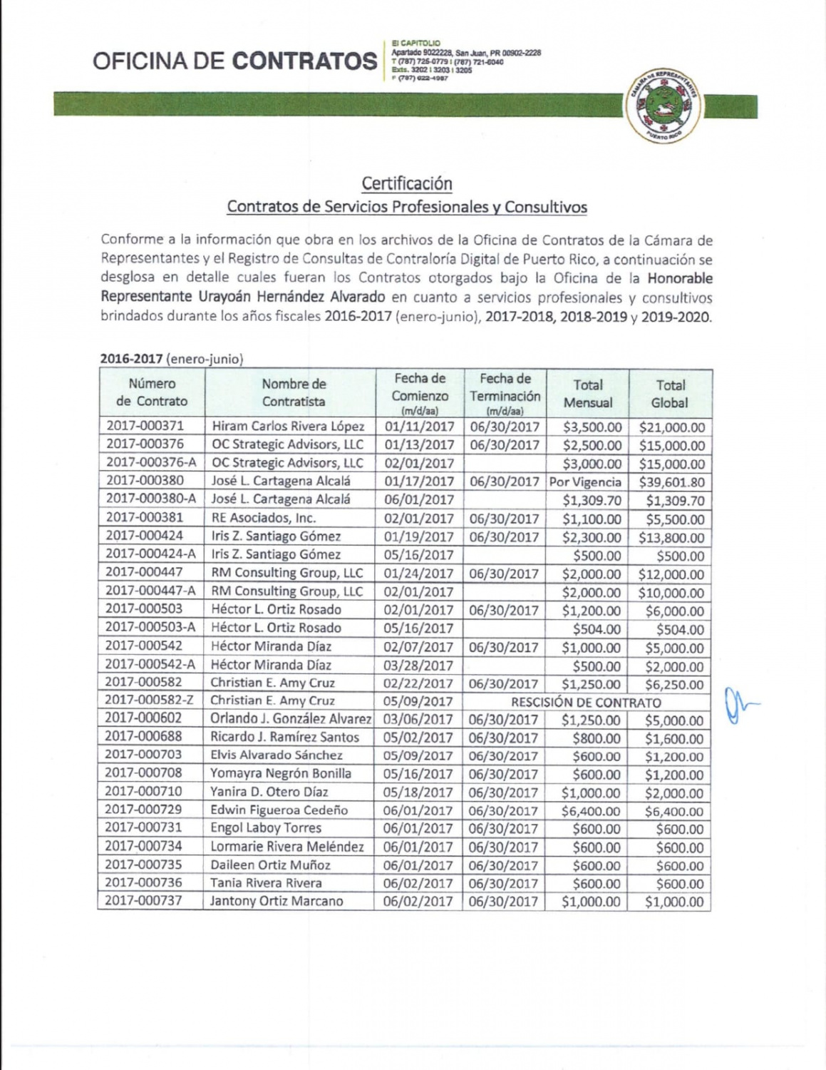 En tal sentido, expuso Aponte Rosario, los señalamientos figuran en la información que le fuera entregada y certificada el día 19 de agosto por parte de la Oficina de Contratos de la Cámara de Representantes, luego de haber presentado un recurso legal ante el Tribunal de Primera Instancia en San Juan para conocer los ingresos de los empleados del representante, Urayoan Hernández Alvarado.