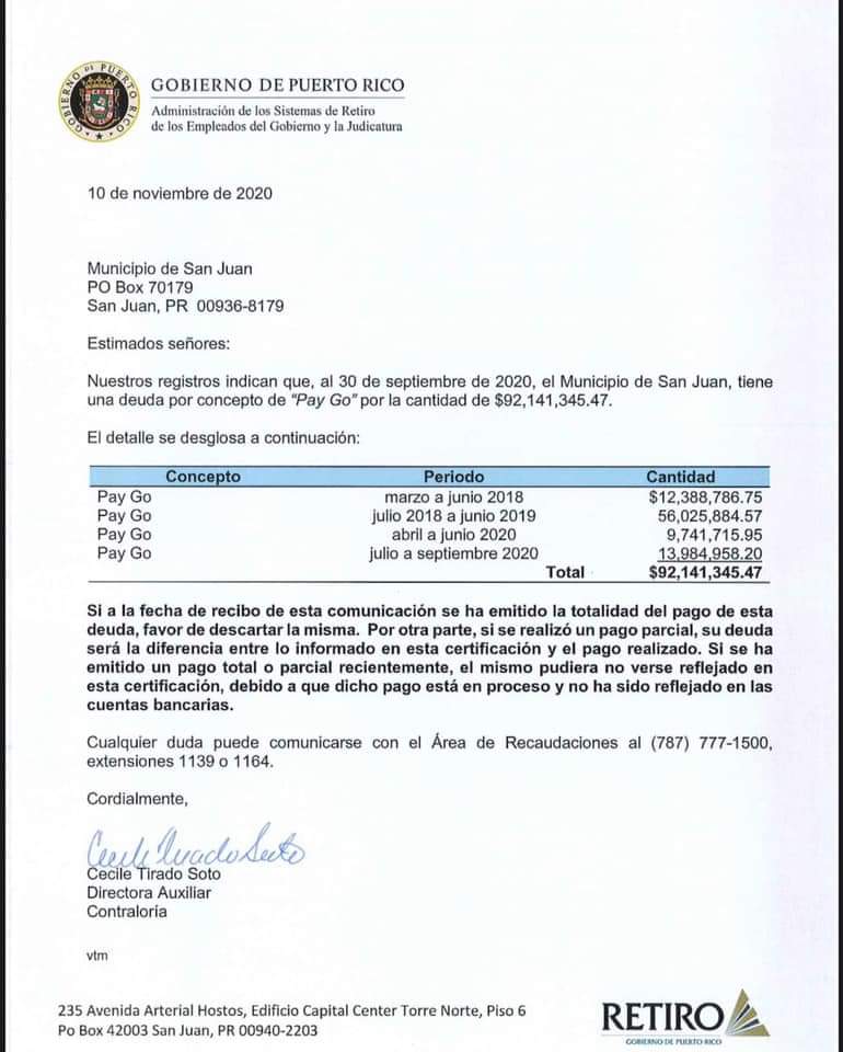Un documento firmado por Cecile Tirado Soto (directora auxiliar de la Contraloría de los sistemas de retiro) certifica que el municipio de San Juan debe mas de 92 millones de dólares del dinero de retiro de sus empleados.