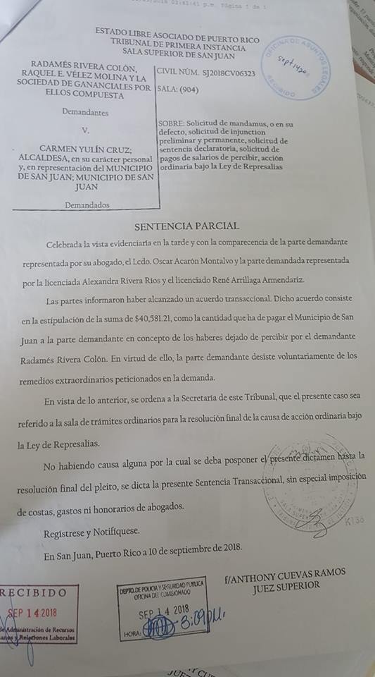 Luego que el tribunal supremo no acogiera la petición del municipio de San Juan en un caso de expulsión ilegal de un teniente de la policía, el municipio de San Juan llegó acuerdo con el teniente Radames Rivera, para pagarle lo dejado de devengar en ese tiempo que fue expulsado ilegalmente.