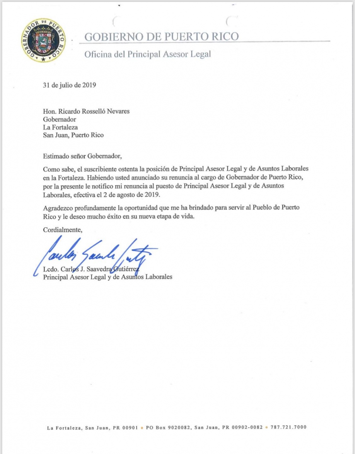 La renuncia se da a horas de que se haga efectiva la salida del gobernador Ricardo Rosselló Nevares (5:00 de la tarde).
