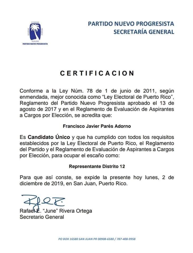 El presidente del Partido Nuevo Progresista (PNP), Thomas Rivera Schatz, informó el lunes que luego de concluido el período de radicación de candidaturas para la vacante en la Cámara de Representantes por el Distrito 12, el Partido certificó al cargo a Francisco Javier Parés Adorno, ya que fue el único que radicó.