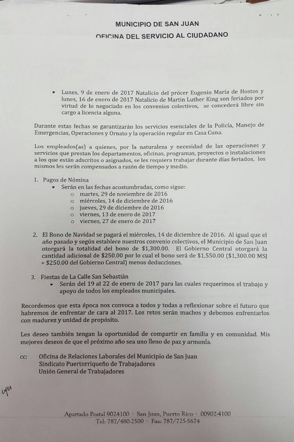 De igual forma el bono de navidad en San Juan lo recibirán el 14 de Diciembre y no antes como en otras ocasiones.