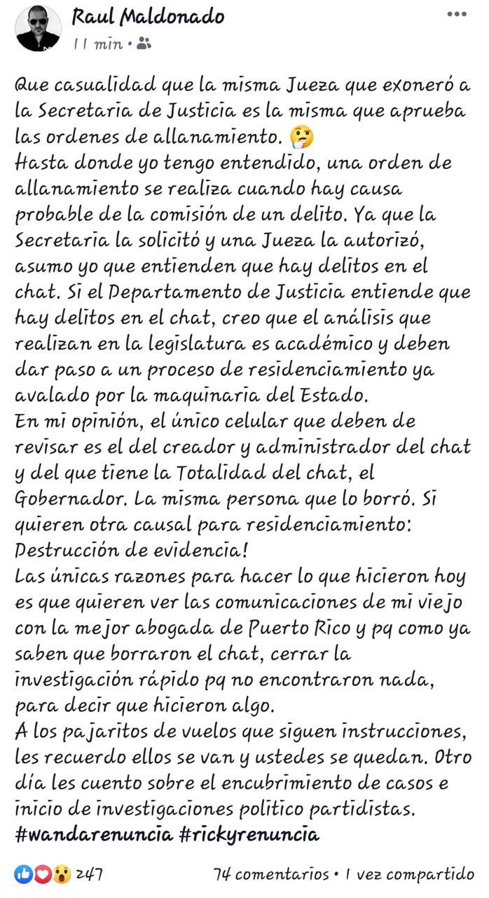 "Las únicas razones para hacer lo que hicieron hoy es que quieren ver las comunicaciones de mi viejo con la mejor abogada de Puerto Rico y pq como ya saben que borraron el chat, cerrar la investigación rápido pq no encontraron nada, para decir que hicieron algo”, añadió.