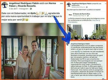 La secretaria de Prensa de La Fortaleza, Yennifer Álvarez Jaimes informó el lunes, que le cancelaron el contraro a Angelimarí Rodríguez Pabón con la Oficina del Gobernador, esto, ante comentarios publicados en redes sociales en contra de manifestantes.