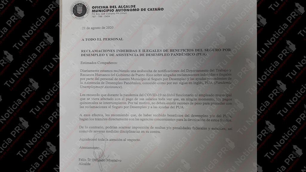 Una carta de la Oficina del Alcalde de Cataño, con fecha del 21 de agosto de 2020, fue recibida en la redacción de Tu Noticia PR. El titular de la misiva denuncia reclamaciones indebidas e ilegales del beneficio del seguro por desempleo y de desempleo pandémico, PUA por sus siglas en inglés.