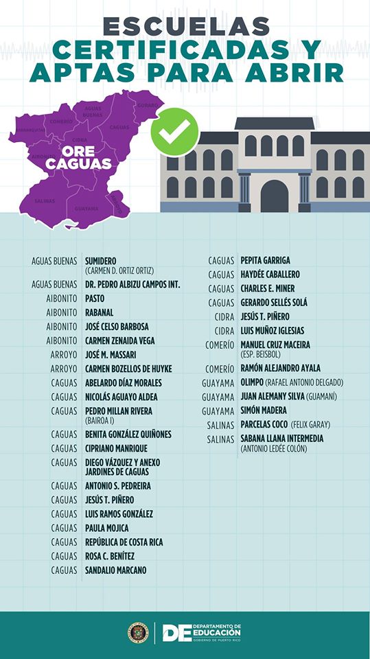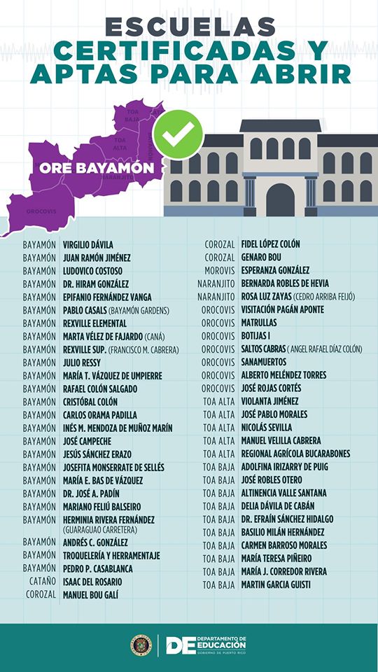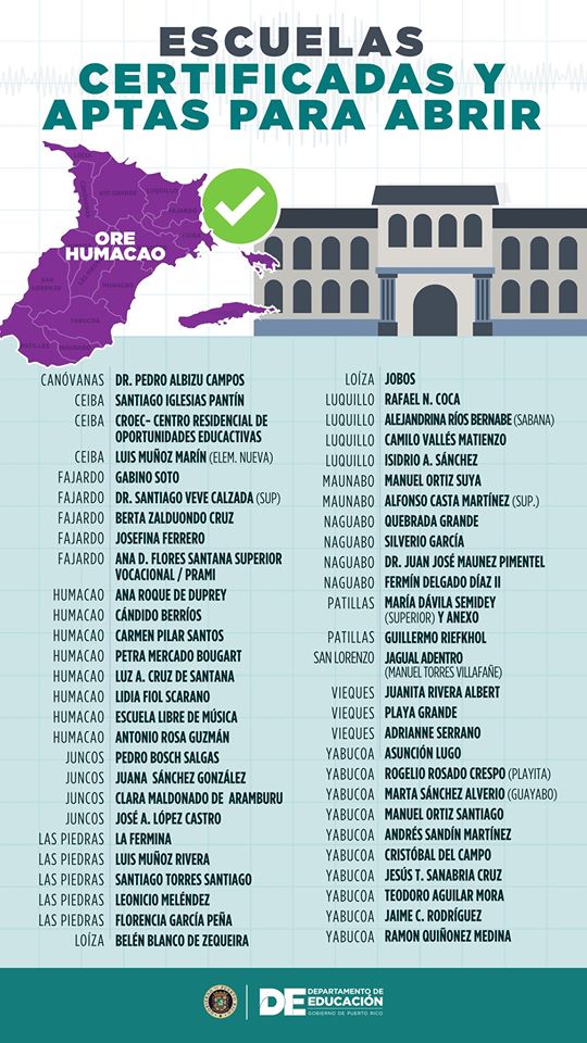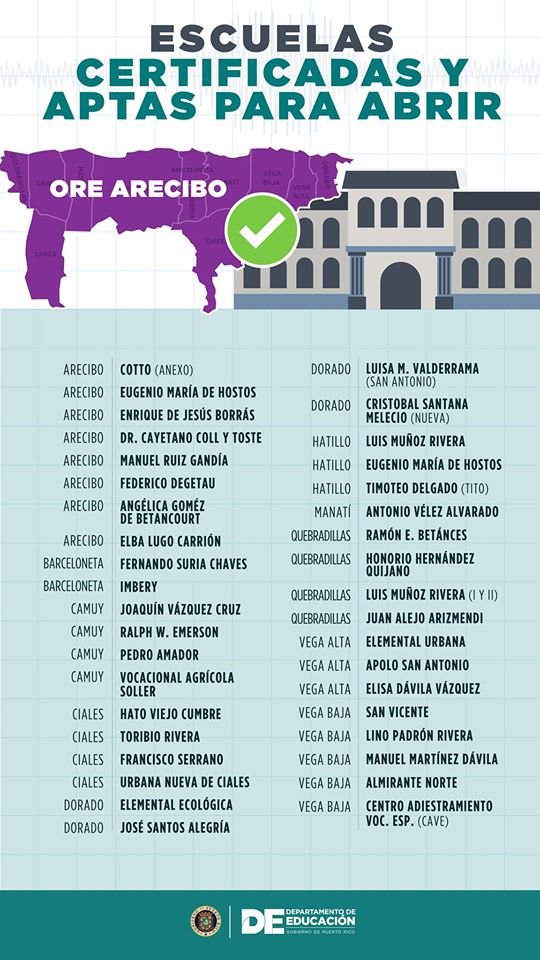 "Como establecimos desde inicios de esta emergencia, no abriríamos ninguna escuela sin haber sido inspeccionada y certificada por los ingenieros. Luego de varios días de trabajo y evaluaciones, hoy anunciamos las primeras 224 escuelas que reanudarán clases. Este fue un análisis amplio entre todos los componentes del comité, que incluye a representantes del Departamento de Educación, la Oficina para el Mejoramiento de Escuelas Públicas (OMEP), la Autoridad para el Financiamiento de la Infraestructura (AFI) y la Autoridad de Edificios Públicos (AEP)”, indicó la gobernadora.