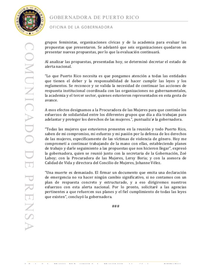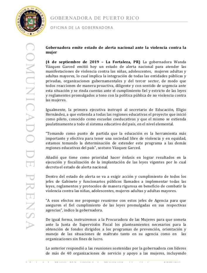 Ello, reveló en un comunicado, implica la integración de todas las entidades públicas y privadas, organizaciones gubernamentales y del tercer sector, de modo que todos reaccionen de manera proactiva, diligente y con sentido de urgencia ante esta situación y se rinda cuentas ante el cumplimiento fiel y estricto de las leyes y reglamentos promulgados a tono con la política pública de no violencia contra las mujeres.