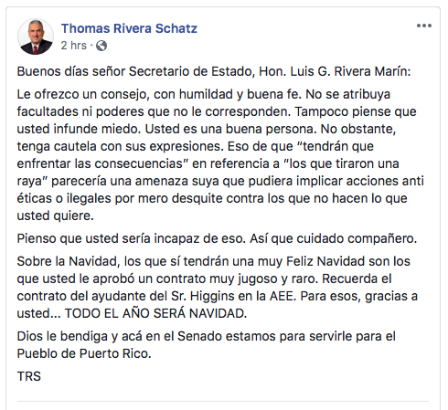 El presidente del Senado, Thomas Rivera Schatz recurrió nuevamente a su cuenta de Facebook para reaccionar a señalamientos del secretario del Departamento de Estado, Luis G. Rivera Marín luego que el Alto Cuerpo no aprobara la derogación de la Ley 80.