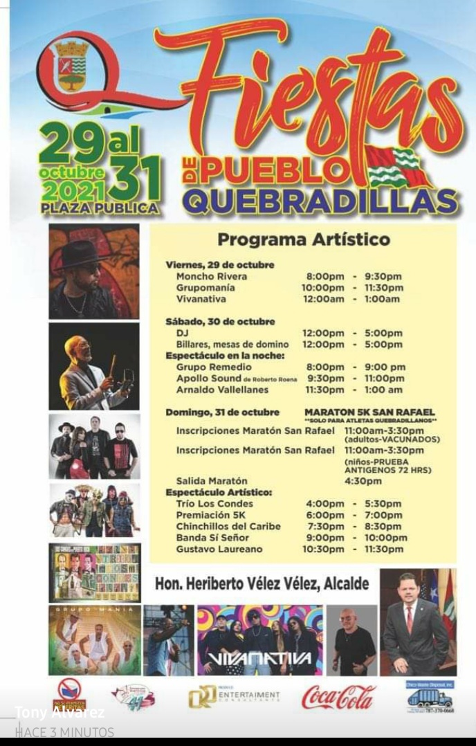 El alcalde invitó a los quebradillanos a darse cita durante el fin de semana para que disfruten de lo que describió como "un excelente espectáculo artístico y para que compartan con sus familiares y amigos”.