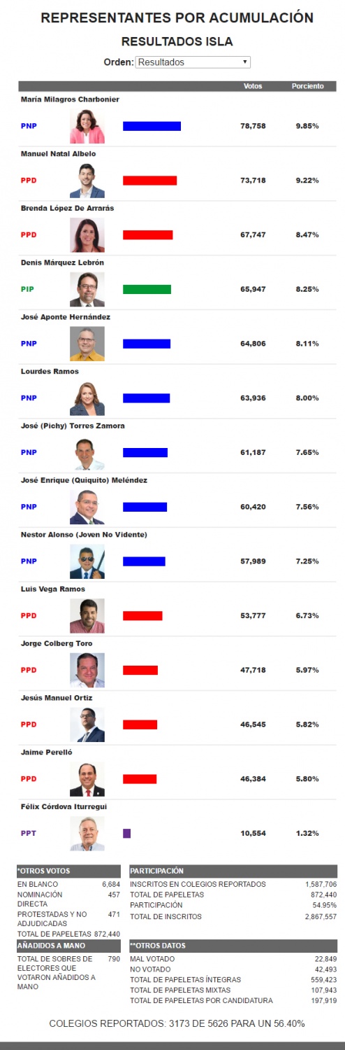 El cómputo lo encabeza María Milagros Charbonier, del Partido Nuevo Progresista (PNP), con 43,803 votos para un 9.59%.