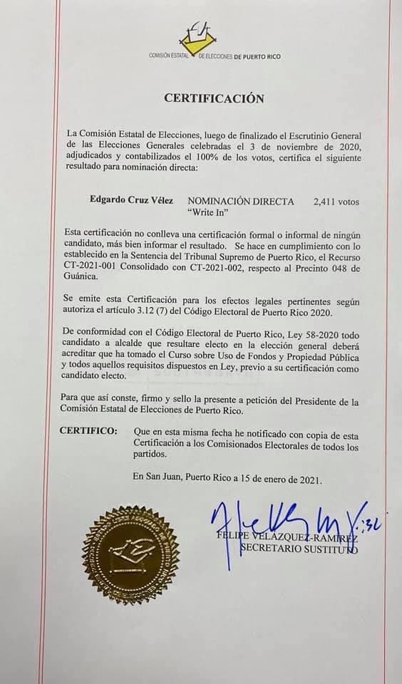 El candidato independiente Edgardo Cruz fue certificado en la madrugada del viernes como ganador de la alcaldía de Guánica por la Comisión Estatal de Elecciones (CEE).