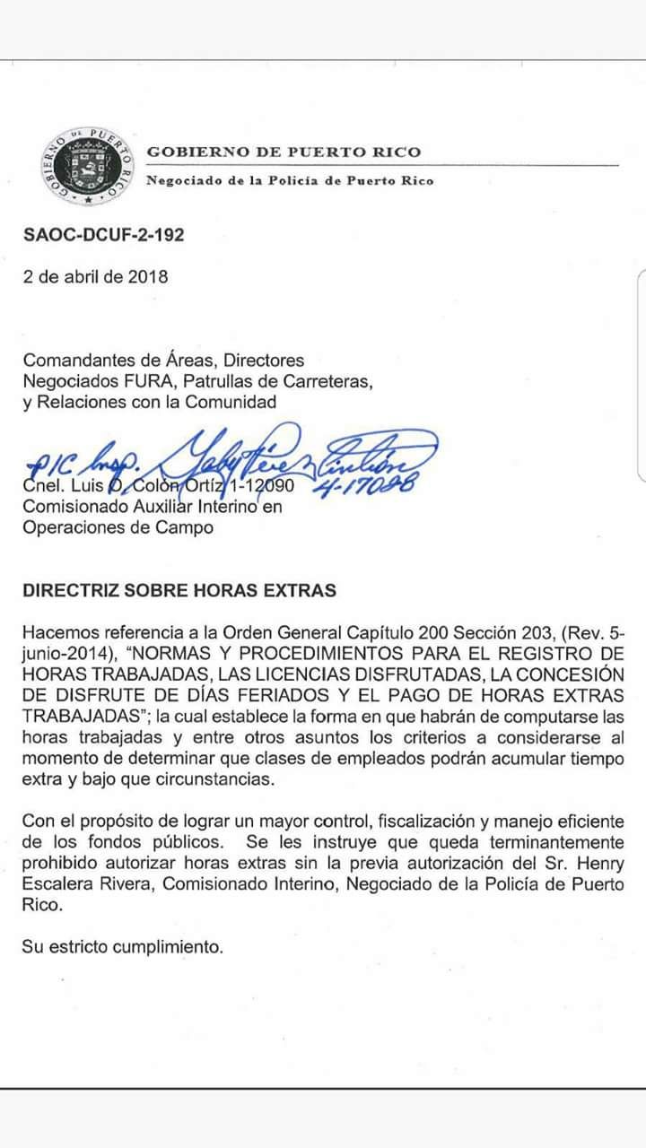Explicó que la Circular SAOC-DCUF-2-192 del 2 de abril de 2018, emitida por el coronel Luis Colón Ortiz, pretende que toda hora extra sea previamente autorizada por el comisionado de la Policía, Henry Escalera.