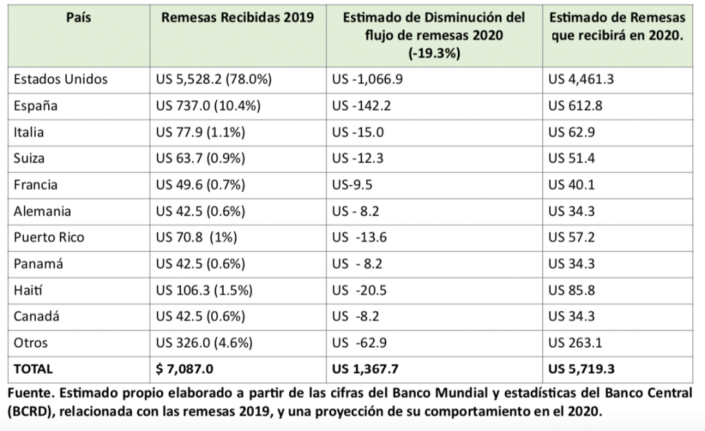 El año pasado el valor total de las remesas familiares formales que recibió la nación dominicana, dijo el diplomático, fue de 7,087.0 millones de dólares, según cifras preliminares del Banco Central de la República, mientras que para este año, por los efectos de la pandemia del Covid-19, en los principales países emisores de esa divisa, estimamos que solo llegarán 5,719.3 millones a los hogares nacionales ante una caída de 19,3 por ciento.