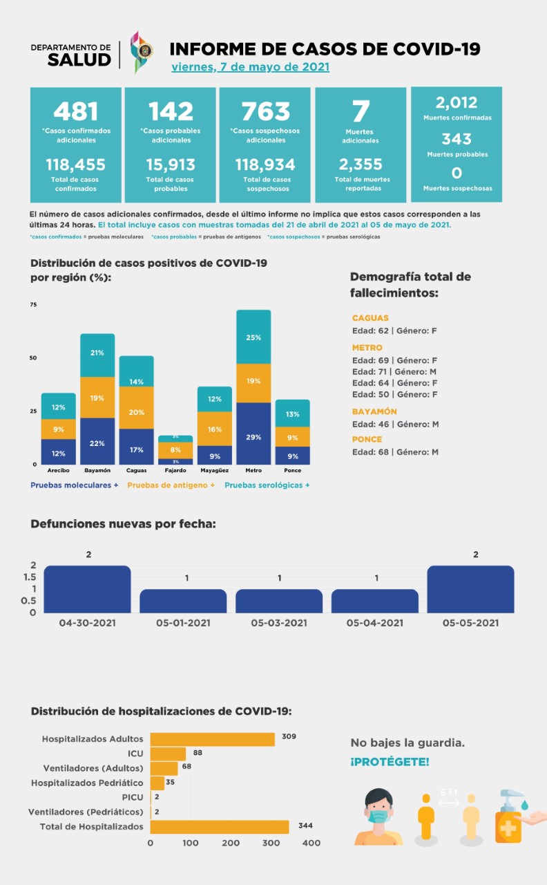 El informe del Departamento de Salud da cuenta de 7 muertos y 481 casos positivos confirmados de COVID-19 en el periodo del 31 de abril al 5 de mayo.
