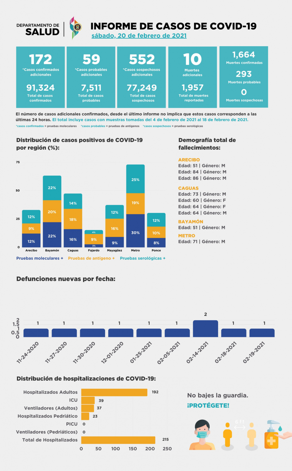 10 muertes de los meses de noviembre a febrero, así como 172 casos positivos confirmados es el resultado del informe del Departamento de Salud para el periodo del 4 al 18 de febrero de 2021.