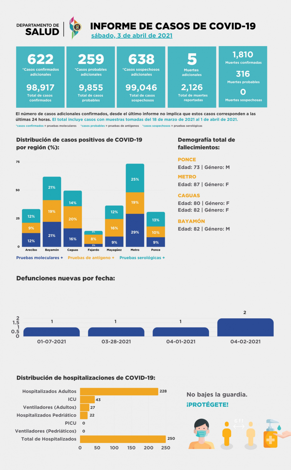 El informe del COVID-19 del Departamento de Salud –que comprende el periodo del 18 de marzo al primero de abril- da cuenta de 622 casos positivos confirmados y 5 muertes.