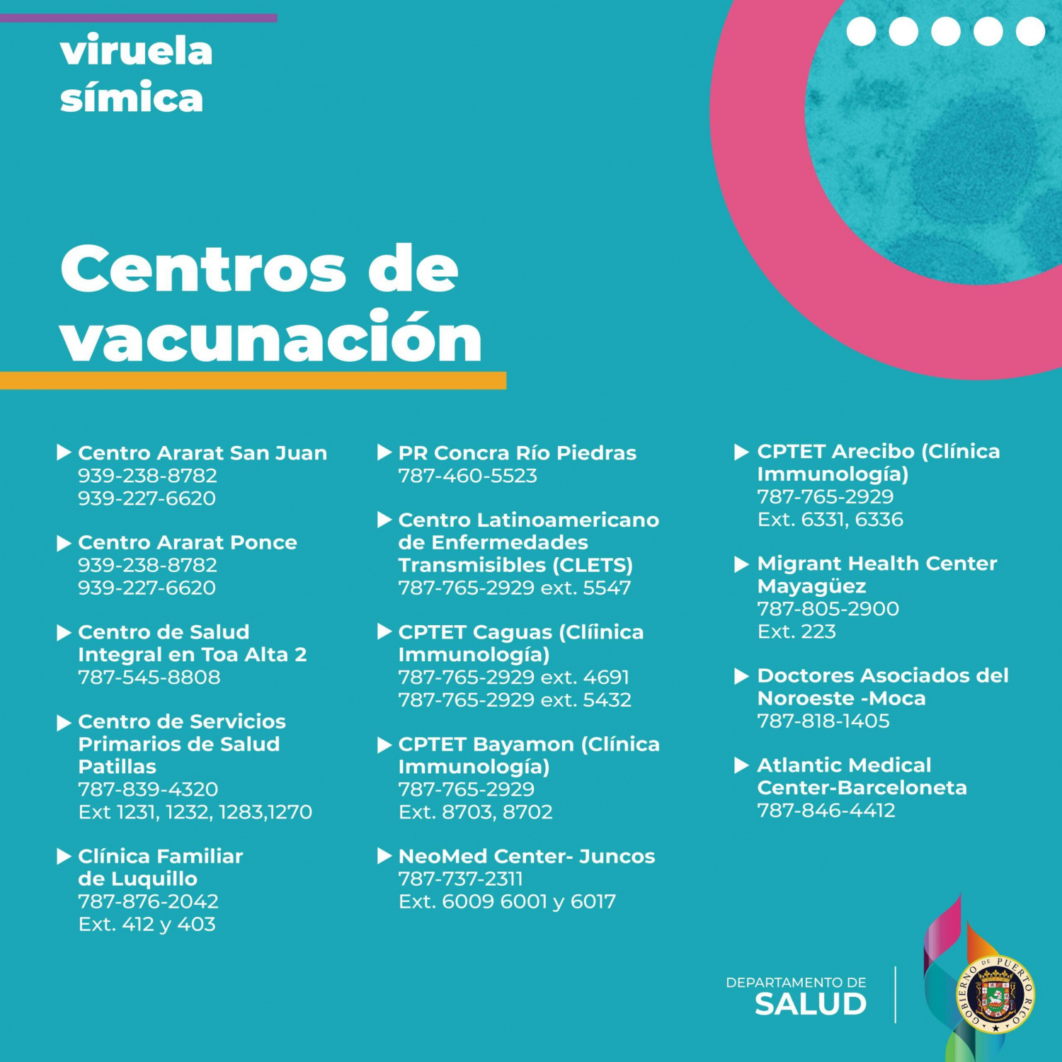 Para obtener el detalle de los centros de vacunación contra la viruela símica, información educativa, el boletín especial de casos semanales, guía de respuesta y más, visite https://www.salud.gov.pr/viruela_simica. Los proveedores de salud podrán consultar al Departamento de Salud 24/7 al 787-404-5361.
