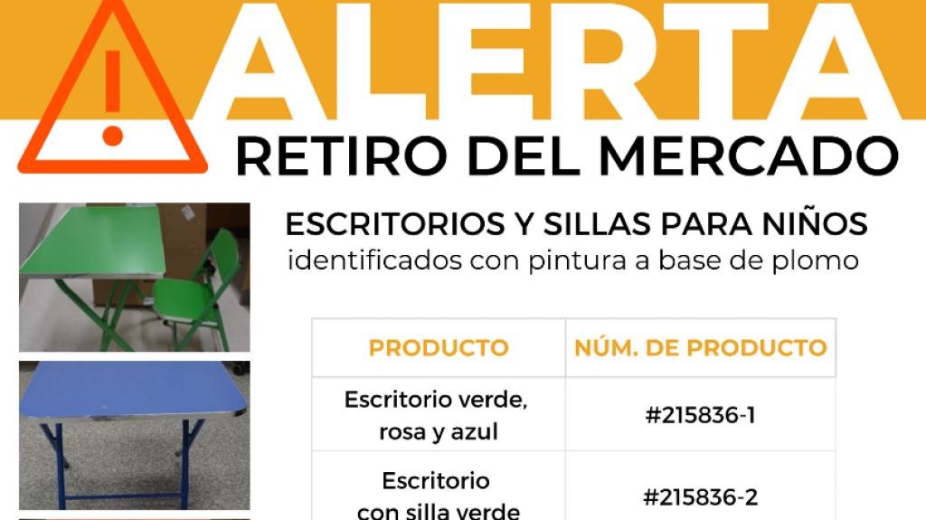 "Se alerta a la ciudadanía del retiro de escritorios y sillas para niños vendidos en el Almacén China en Hato Tejas, Bayamón, identificados con pintura a base de plomo. Se exhorta al consumidor a que devuelva los artículos de forma inmediata. ¡Minimiza el riesgo de exposición!”, escribió el Departamento en su cuenta de Twitter.