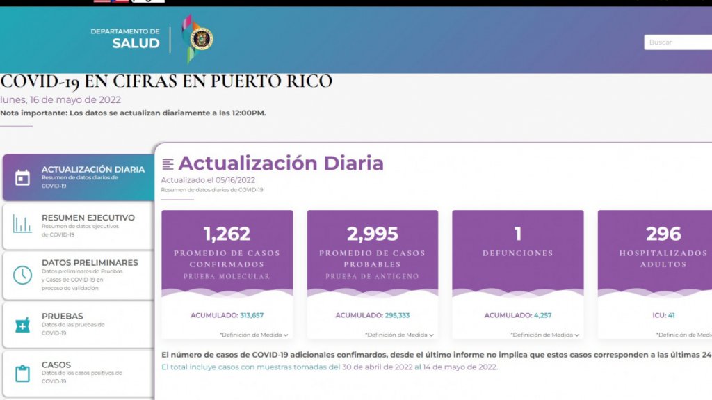 El informe de COVID-19 del Departamento de Salud (DS) reportó el lunes sobre 1,262 casos positivos confirmados, 2,995 casos probables y una muerte.