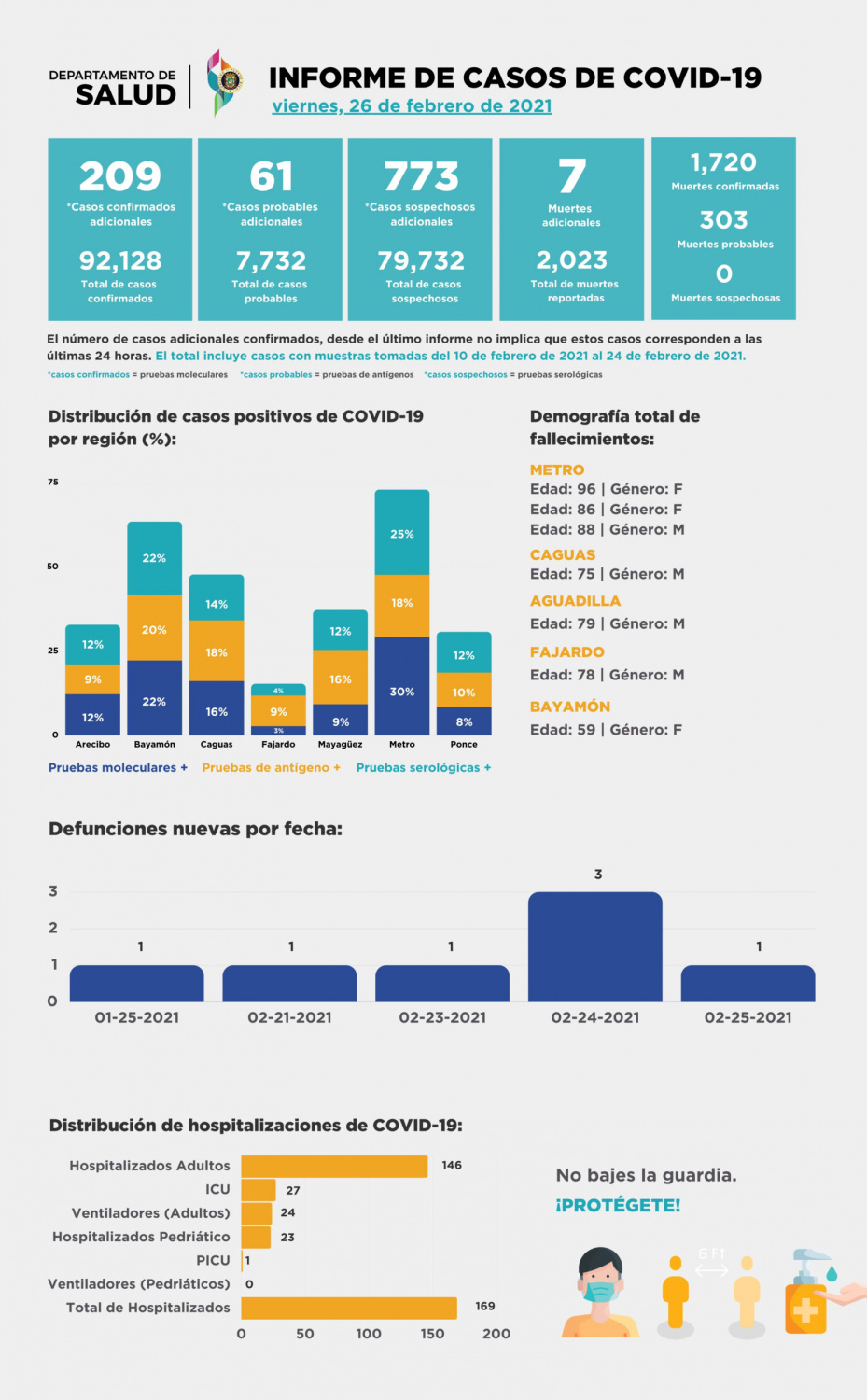 El informe del Departamento de Salud del periodo del 10 al 24 de de febrero reporta 7 muertes y 209 casos positivos confirmados de COVID-19.