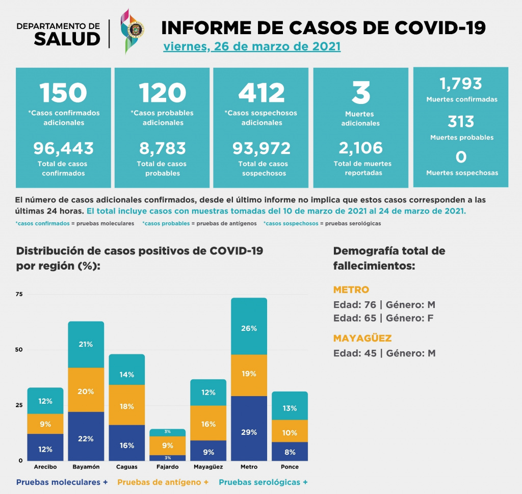 Las muertes corresponden a dos hombres, de 76 y 45 años, de las regiones Metro y de Mayagüez, respectivamente; y de una mujer de 65 años de la región Metro.
