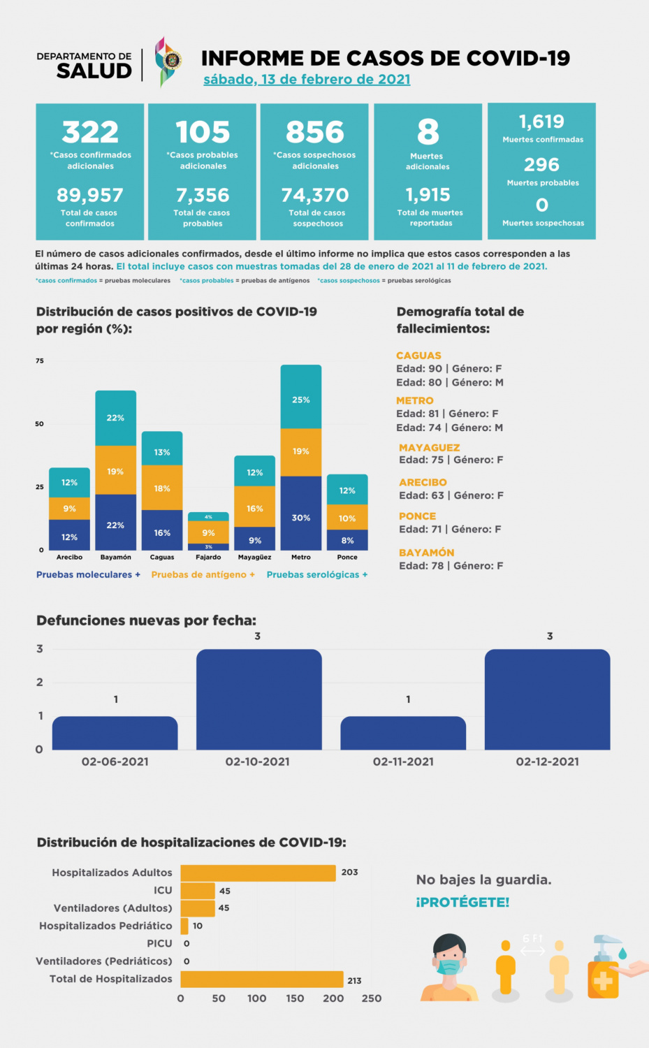 Los fallecimientos se reportaron en la región de Caguas, una mujer de 90 años y un hombre de 80; una mujer de 81 años y un hombre de 74 años de la Región Metro; una mujer de 75 años de la región de Mayagüez; una mujer de 63 años la región de Arecibo; una mujer de 71 años de la región de Ponce y una mujer de 78 años de la región de Bayamón.
