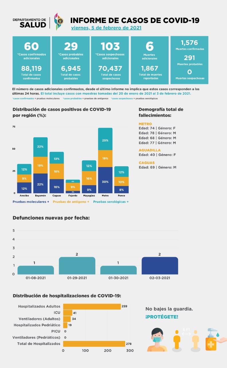 De acuerdo al reporte, se trata de 3 hombres y una mujer de 74 a 78 años de la región Metro; una mujer de 40 años de la región de Aguadilla y un hombre de 69 años de la región de Caguas.