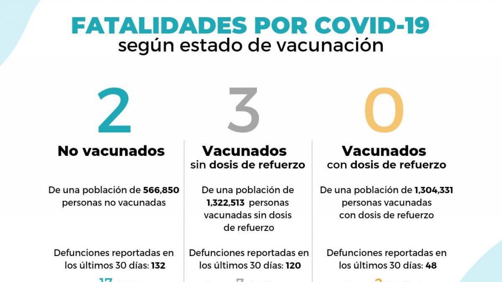 Sobre los fallecimientos, dos no estaban vacunados y tres no tenían el refuerzo. En total se le atribuyen al COVID-19 4,109 muertes.