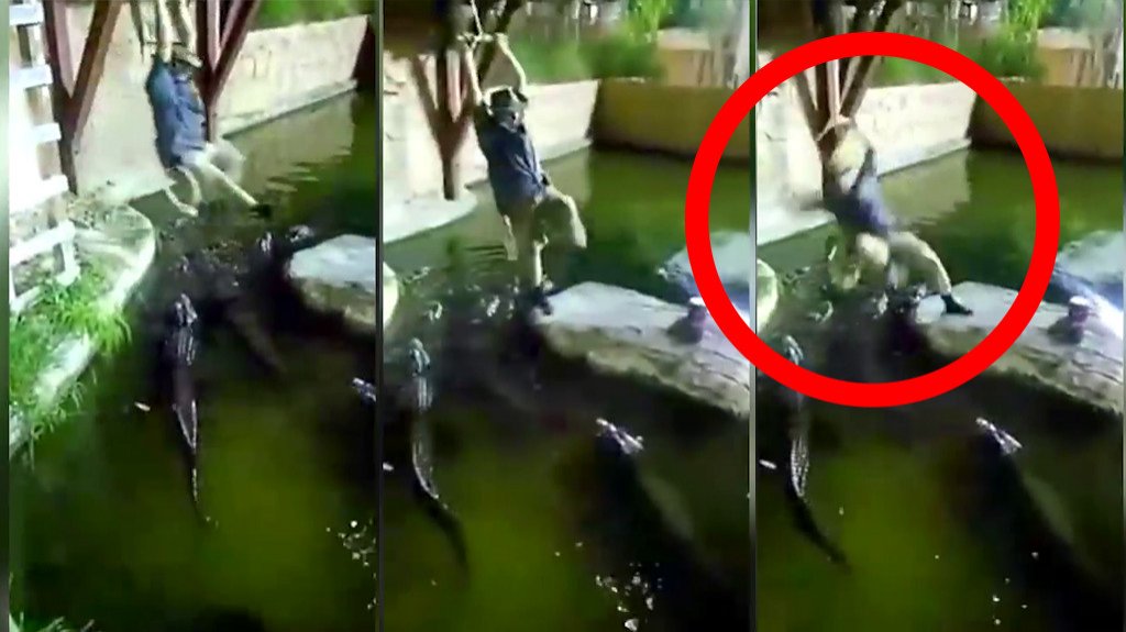 VIDEO: Hombre intenta acrobacia y cae en estanque de cocodrilos