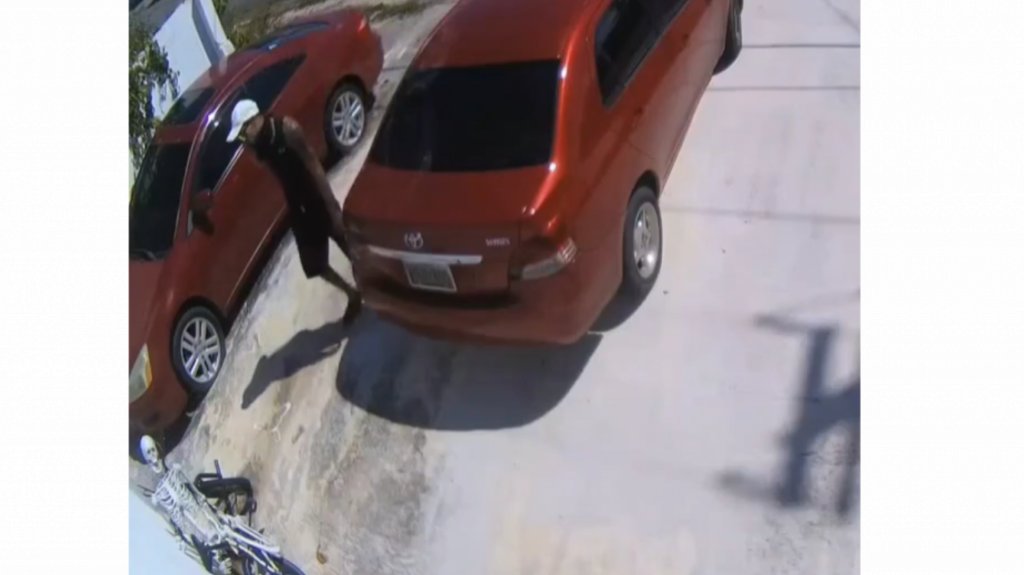 Las cámaras de seguridad captaron como el tipo disimulaba hablar por celular cuando cogio un "esqueleto” y lo metió en el baul de un Yaris y se lo llevó.