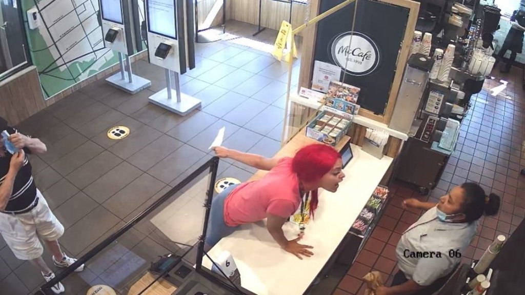 Durante los siguientes cuatro minutos, la mujer arrojó todo lo que pudo sobre el mostrador: letreros de piso mojado, un bote de basura, números de pedido de plástico, otro letrero de piso mojado.