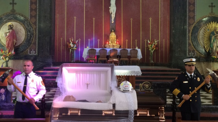 Bomberos, oficiales, supervisores y el jefe del Cuerpo de Bomberos rindieron homenaje póstumo al tercer jefe de la agencia, Leopoldo García Viera, durante el velatorio en la iglesia Espíritu Santo de Hato Rey.