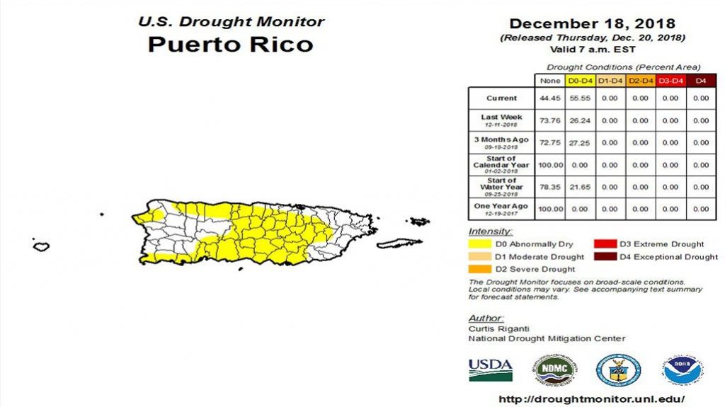 El estimado de población en las áreas con condiciones anormalmente secas es cero, según indica el informe del Monitor de Sequía. El máximo nivel de sequía es sequía excepcional.