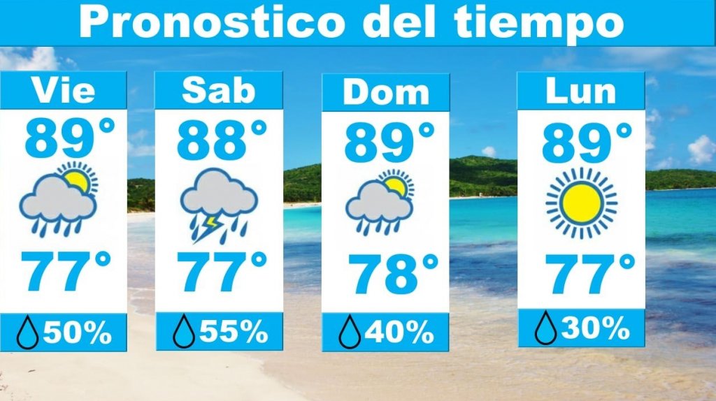 Hoy es Viernes y nos esperan temperaturas sobre 80s-90s hoy mantiene ese 50% de probabilidad de lluvia que se mantiene para el noroeste de Puerto Rico pero lluvias dispersas a través de la isla no se descartan.