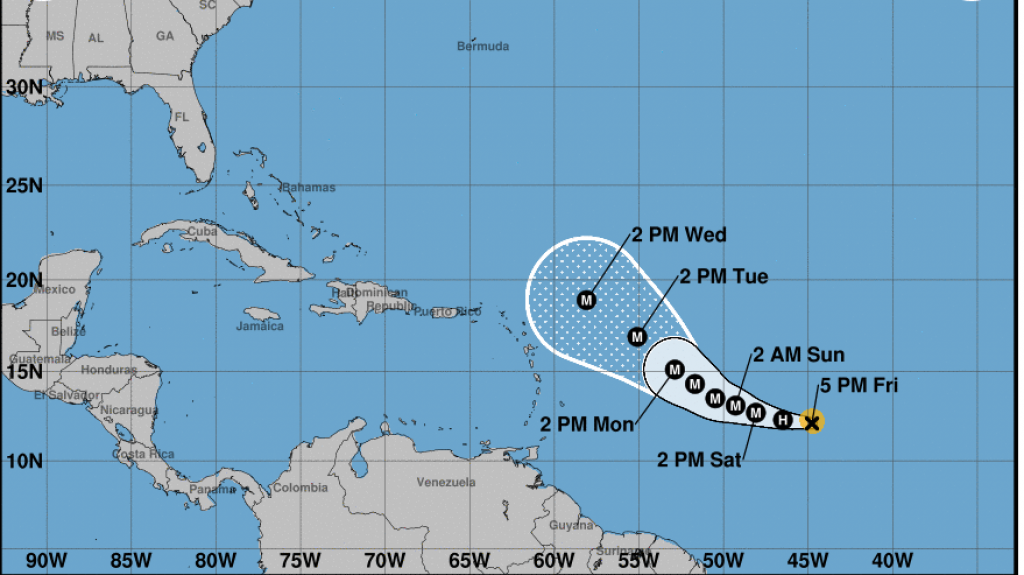 El Centro Nacional de Huracanes (CNH), en Miami, Florida informó en su boletín de las 5:00 de la tarde, quese localizó el centro del huracán Sam cerca de latitud 12,1 grados Norte, longitud 44,8 grados Oeste.