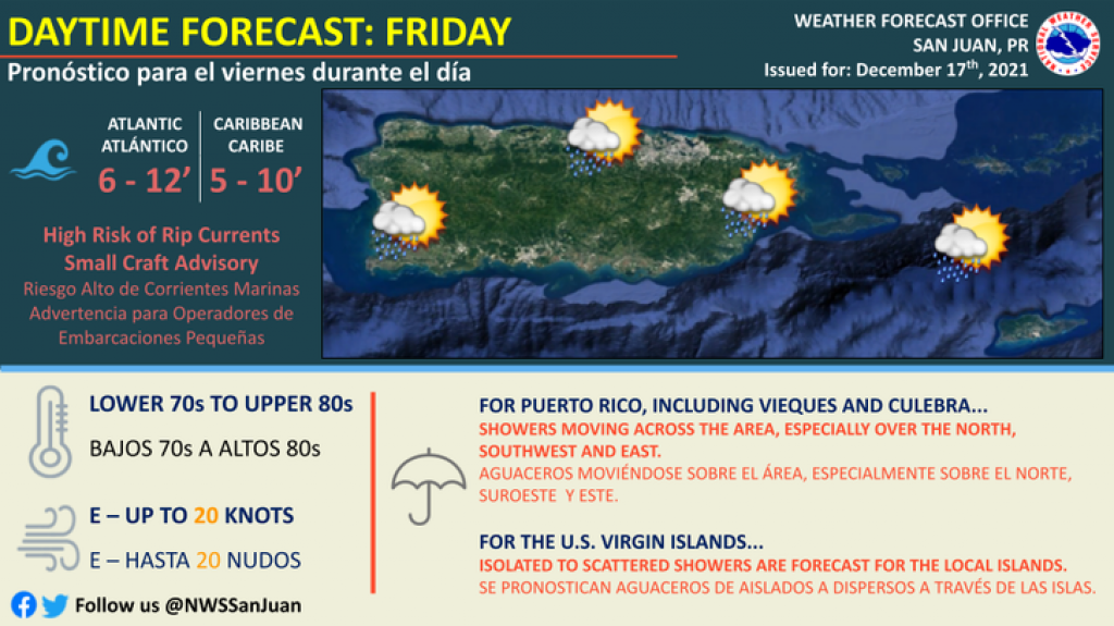 Se esperan aguaceros dispersos en la tarde para porciones del oeste de Puerto Rico. Se espera que el viento local este entre 10 a 20 mph con ráfagas ocasionales del este noreste. La temperatura máxima del día estará en los bajos a mediados 80 a través de las elevaciones bajas, mientras en las elevaciones altas se observarán temperaturas en los mediados a altos 70s.