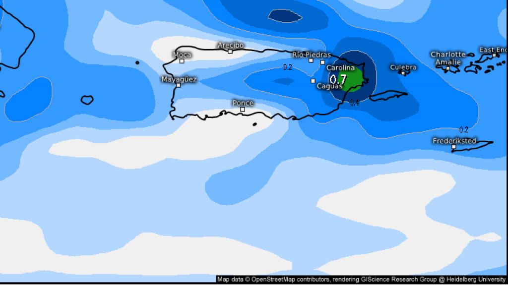 Las condiciones marítimas están deterioradas, con olas de 5 a 7 pies a través del Atlántico. En el mar Caribe las olas oscilan de 4 a 6 pies. Bañistas deben ejercer precaución a través de las aguas del norte y este de las islas, incluyendo a Vieques y Culebra, ante un riesgo elevado de corrientes submarinas. El resto de las costas presenta un riesgo moderado de corrientes. De igual forma operadores de embarcaciones pequeñas deberán ejercer cautela.