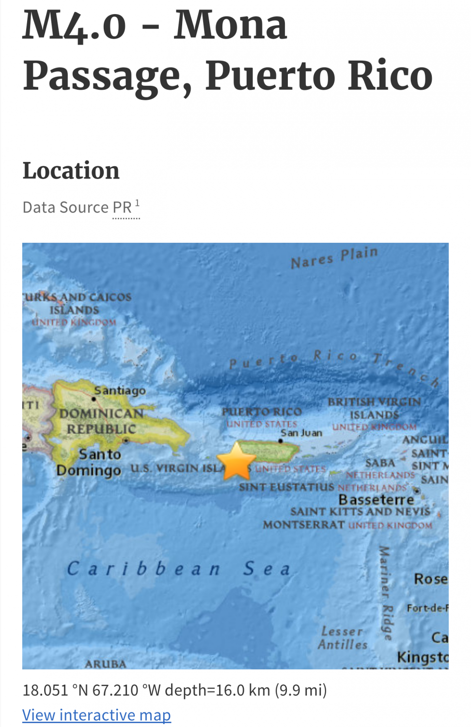 A eso de las 9:21 am se registró un temblor moderado con magnitud 4.0, con epicentro en Cabo Rojo. Ciudadanos ubicados cerca de esta región lo reportaron como sentido, puesto a que su profundidad fue de tan sólo 16 kilómetros. No hay aviso de Tsunami.
