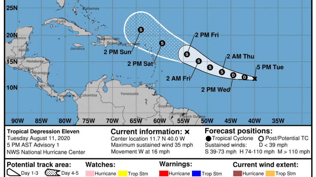 A las 5:00 p.m., el Centro Nacional de Huracanes clasificó a la fuerte onda tropical como la depresión tropical #11. El centro de este ciclón tropical se ubica en la latitud 11.7ºN y longitud 40ºO, moviéndose al oeste a 16 mph. Tiene vientos máximos sostenidos de 35 mph. Se espera que pase al noreste del país para la tarde del domingo, incrementando significativamente la humedad y el oleaje.
