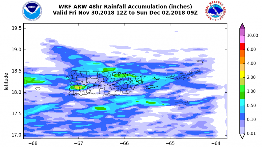 La llegada de estos grupos nubosos generará tiempo variable, siendo los municipios del este (también Vieques y Culebra) y sureste del país los que reciban algunas precipitaciones de carácter pasajero. El resto de la isla tendrá mañanas soleadas y un poco calurosas, pero alrededor del mediodía podrían desarrollarse algunos aguaceros a través del oeste-interior y noroeste, también en sectores del norte. Las acumulaciones serían mínimas.
